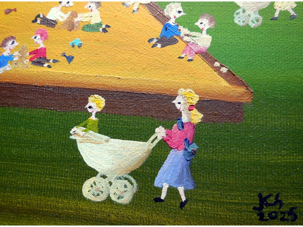 Na naivním obrázku Dětské hřiště zaznamenávám dětské hry a projevy dětí. Copak děti asi čeká? Jedno je jisté: každé si do života najede svou povahou. Na naivním obrázku jedno hledí zvědavě vpřed, druhé vztekle vyhazuje hračky z kočárku. Buďme rádi, že si nemusíme dávat špunty do uší.