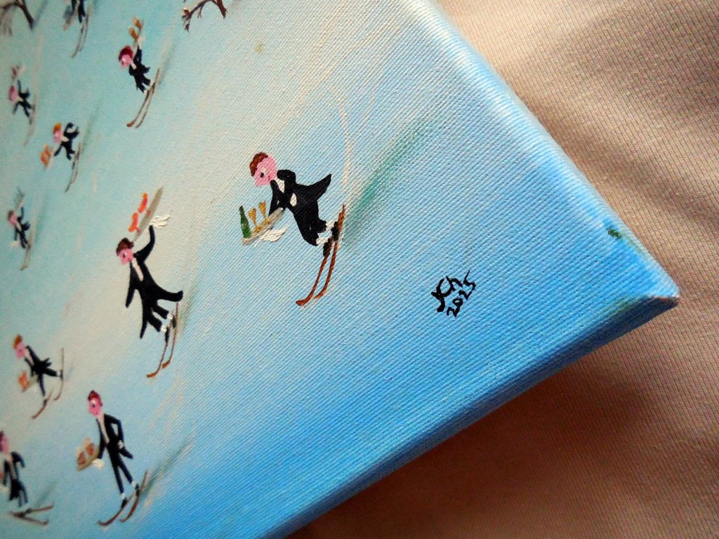 Naivní obrázek, který vznikl díky jedné větě – replice z filmu. Můj oblíbený film Ladislava Smojlaka a scénáristy Zdeňka Svěráka Vrchní, prchni! mě zkrátka inspiroval. Jestli ale sjíždí můj zasněžený kopec i nějaký falešný vrchní, těžko říct. Sama nevím, který z nich to je. Asi bych taky naletěla.